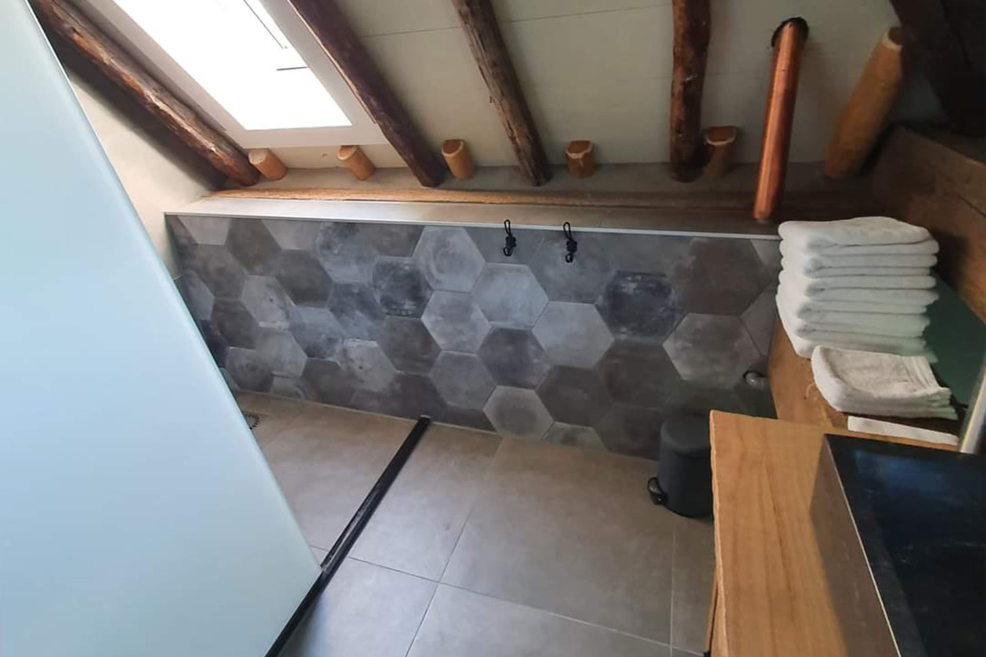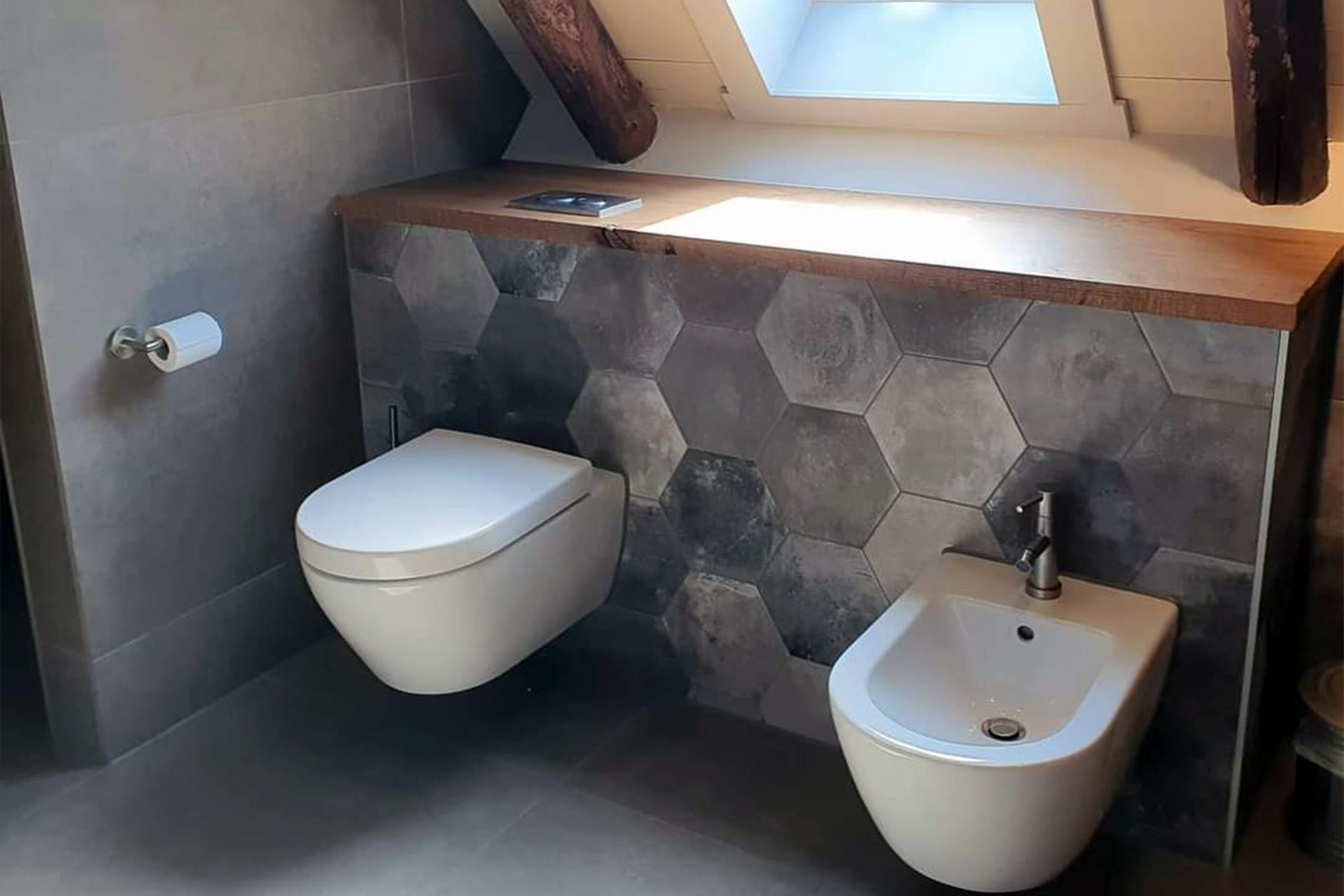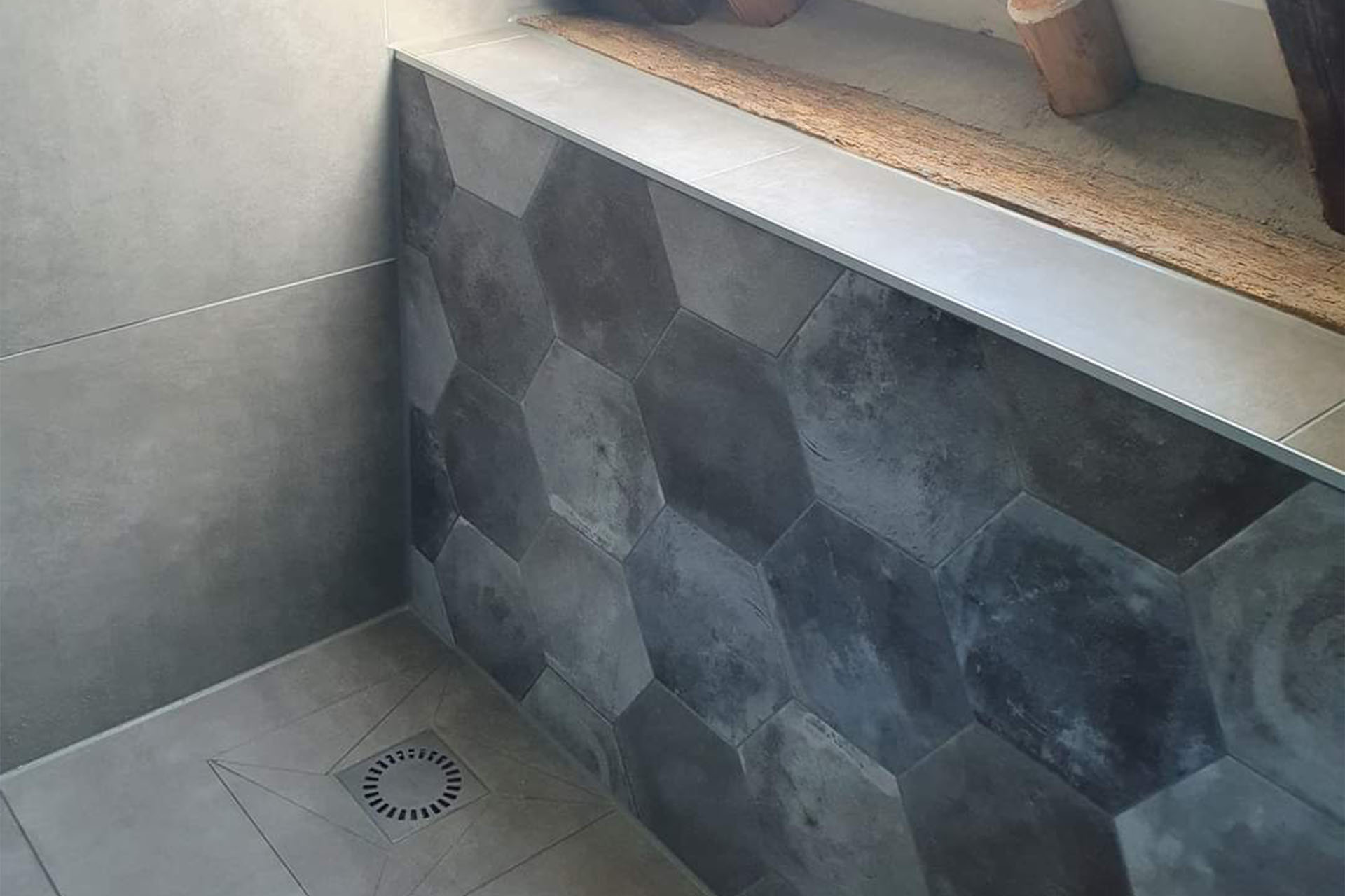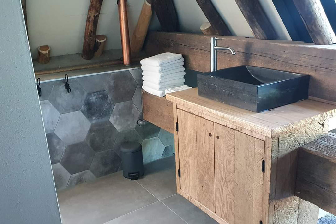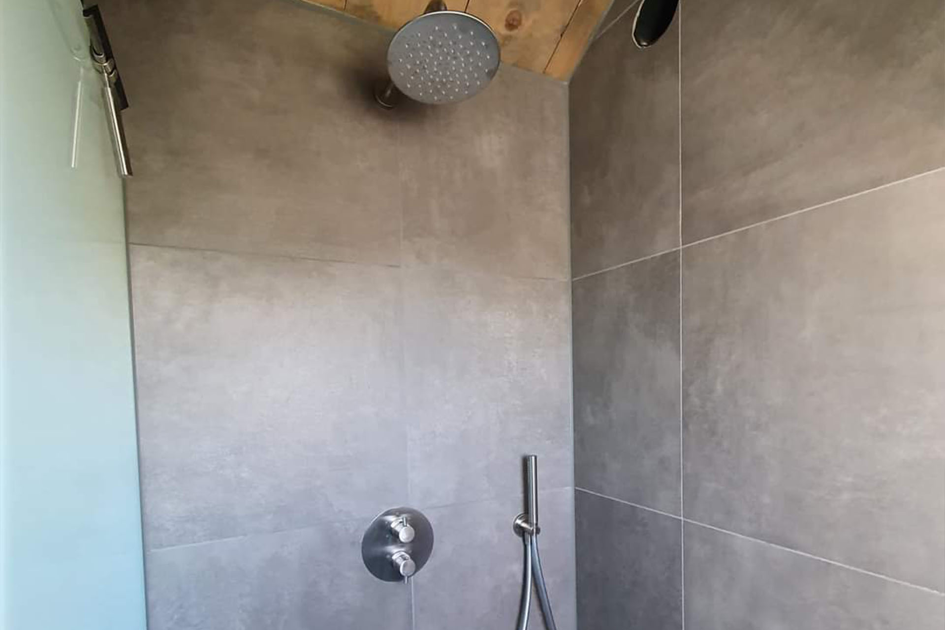 Deze badkamer is de perfecte combinatie van modern design en natuurlijke warmte. De eigentijdse tegels en het strakke sanitair worden gecombineerd met prachtige houten accenten, die zorgen voor een sfeervolle en uitnodigende uitstraling. Meer weten? Neem contact op voor een vrijblijvende offerte.